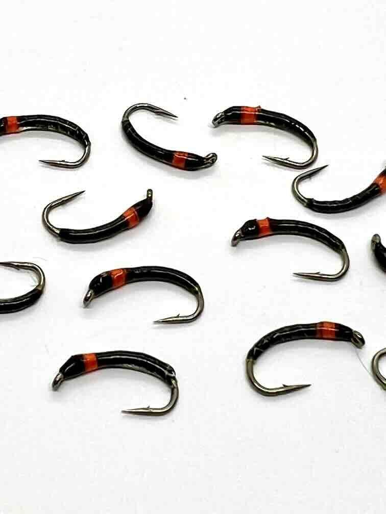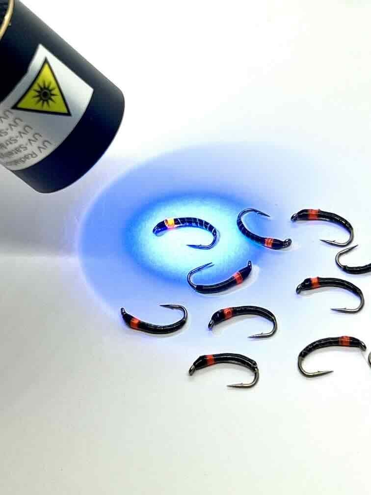 Chiro pour la pêche en réservoir. Ce chironome a la particularité d'avoir d'une part, une collerette (tag) orange fluo et d'autre part, un cerclage qui lui aussi réagit aux UV ce qui le rend très attractif.