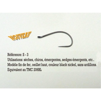 Pochette d'hameçons de 25 ou 50 pièces. Ce modèle a les mêmes caractéristiques que le S-4, mais sans l'ardillon d'ou la dénomination S-4 "SA" disponible de la taille #10 à #20