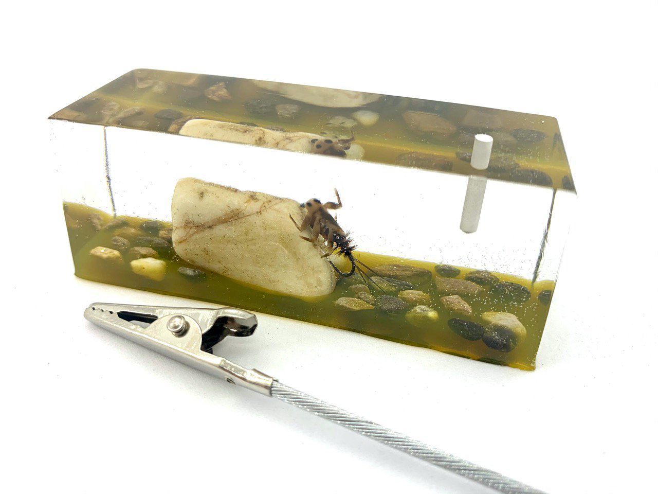 L'Ice Flie "Patache" est une réalistion d'une nymphe imitant une "patache" dans son élément, le tout emprisonné dans une résine époxy.