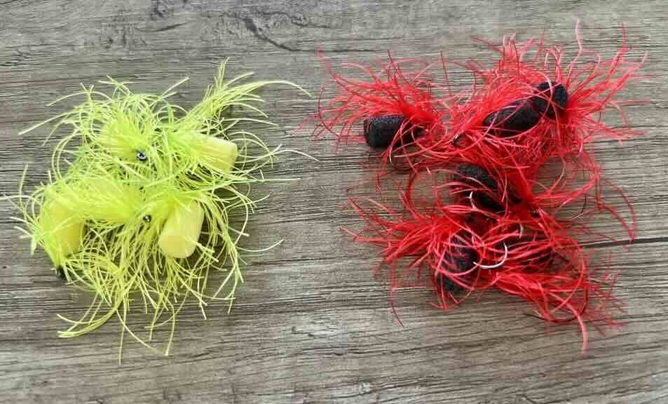 Le lendemain me voilà de retour sur le plan d'eau avec un mix de ces élastiques (jaune, olive et brun ) accroché sur un hameçon pour imiter l'herbe. Pas mal de poissons à l'épuisette ce jour-là: le poulpe était né.