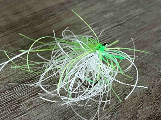 Ce montage est né à la suite d'une sortie réservoir où un copain, en fouettant, accrochait l'herbe derrière lui et en reposant sa sèche pleine d'herbe sur l'eau, les poissons attaquaient sa mouche avec frénesie.