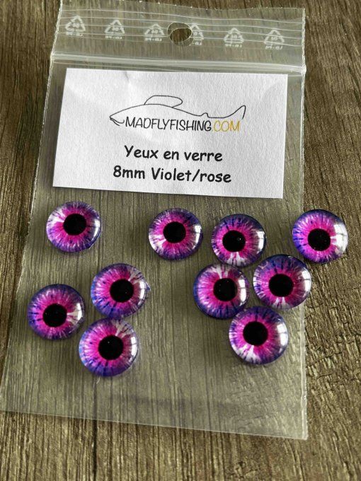 Pochette de 10 yeux en verre de 8mm de diamètre, pour vos steamers carnassiers. Ceux-ci sont sont à coller à la super glue (le petit + est de les englober à l'aide d'une résine UV type Flexman). L'apport de ces yeux à votre montage apportera également un peu de poids en tête de votre streamer (la paire pèse environ 1.5gr)
